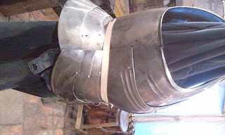 Jako że zamówienie nie precyzowało konkretnych wzorów na podstawie których miałem wykonać cały komplet, pozwoliłem sobie popuścić wodze mojej ascetycznej fantazji i połączyć ten naplecznik z typowo niemieckim napierśnikiem. Chociaż tego typu napleczniki robiono wówczas w Niemczech to sądząc po ikonografii i ilości zachowanych eksponatów z około1480 nie były tak popularne jak te bardziej mobilne, segmentowe, fantazyjnie kanelowane i generalnie dosyć wymyślne w zdobnictwie.